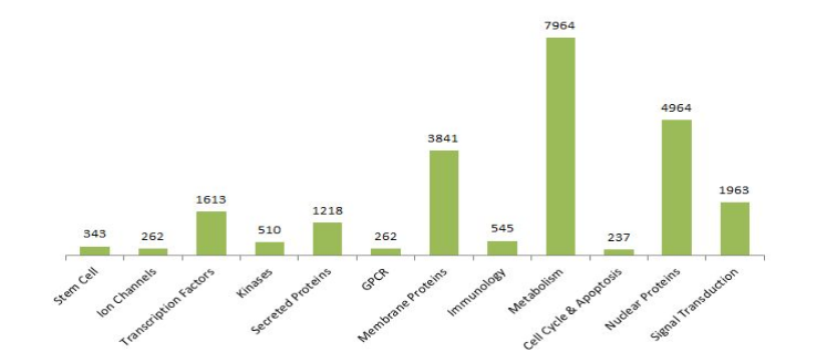 Under current specifications of the 10K microarray chip, 10,728 samples were spotted in duplicates on a single nitrocellulose slide. These include 10,020 overexpression lysates and 708 positive and negative control samples. The premium 17K chip contains 16,242 overexpression lysates. Serial diluted mouse, human and rabbit IgG mixture as positive controls were spotted on three subarrays highlighted in redboxes. Subarrays highlighted in yellowboxes contain serial diluted HEK293T cell lysates as negative controls. All the subarrays contain standard positive and negative controls as shown in the figure above. The major protein family coverage is shown in the figure below.