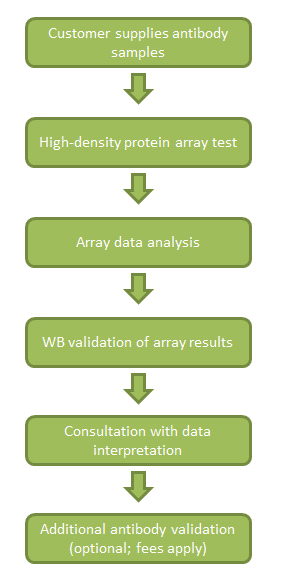 With the UltraMAB array service, OriGene helps you identify reactive proteins of your antibody and potential off-target effects to eliminate the cross-reactivity concerns. Please refer to the flow chart below for the details of this service