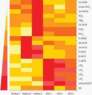 Heat map generated from relative quantitation by LC-MS/MS of oxylipins in the spleens of mice. Visualisation tools like this one help find changing trends within complex sets of data.