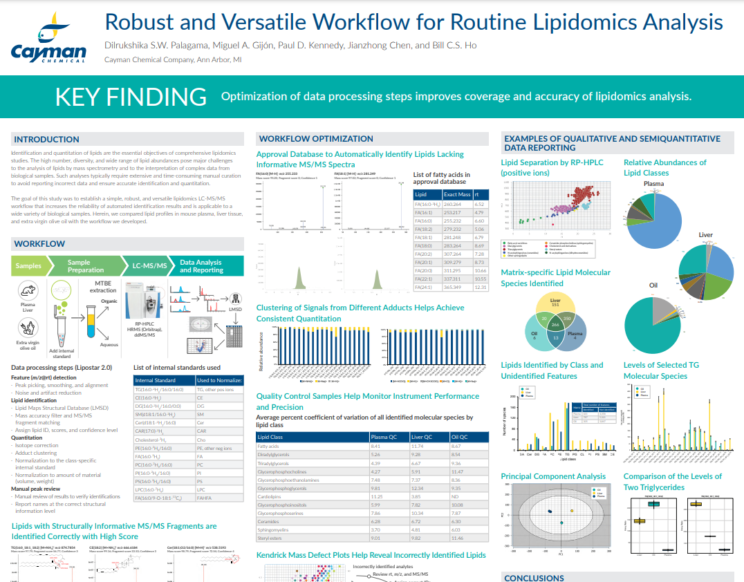 Conducted in state-of-the-art lipid analysis laboratories, Cayman's untargeted lipidomics profiling enables the identification of profile changes across all major lipid classes, or within a single lipid class, including fatty acyls, glycerolipids, glycerophospholipids, sphingolipids and sterol lipids.