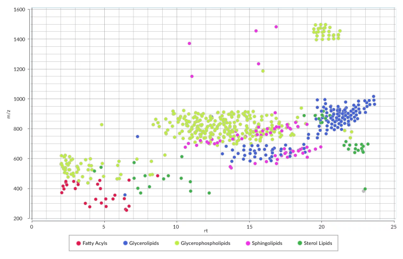 2D feature plot (m/z vs retention time) generated using Lipostar lipidomics software package representing identified molecular species, corresponding to different lipid classes, in human plasma.