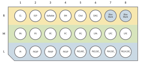 Figure 3. Location of lipids on Cayman Chemical LipiDOT Strips™ - PIPs Plus. Phosphatidylinositol, PI ● Phosphatidylinositol-3-phosphate, PI(3)P ● Phosphatidylinositol-4-phosphate, PI(4)P ● Phosphatidylinositol-5-phosphate, PI(5)P ● Phosphatidylinositol-3,4-bisphosphate, PI(3,4)P2 ● Phosphatidylinositol-3,5-bisphosphate, PI(3,5)P2 ● Phosphatidylinositol-4,5-bisphosphate, PI(4,5)P2 ● Phosphatidylinositol-3,4,5-trisphosphate, PI(3,4,5)P3) ● Phosphatidic Acid, PA ● Phosphatidylserine, PS ● Phosphatidylethanolamine, PE ● Phosphatidylcholine, PC ● Phosphatidylglycerol, PG ● Sphingomyelin, SM ● 3-Sulfogalactosylceramide, Sulfatide ● Cardiolipin, CL ● Cholesterol, Chol ● Lysophosphatidic Acid, LPA ● Lysophosphatidylethanolamine, LPE ● Lysophosphatidylcholine, LPC ● Sphingosine-1-phosphate, S1P ● Diacylglycerol, DAG ● Blue Blank (Xylene Cyanol FF)