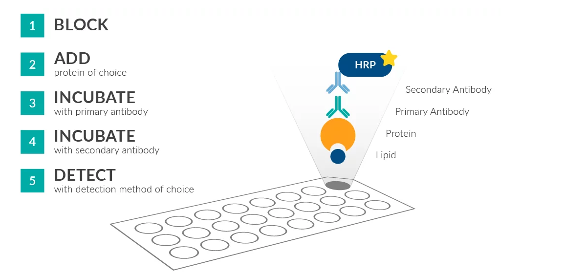 Figure 1. Overview of Cayman LipiDOT Strips™ workflow. Cayman LipiDOT Strips™ are compatible with detection using native proteins or epitope-tagged proteins in conjunction with primary or secondary antibody reporters. Horseradish peroxidase (HRP) is shown above as an example, which in this case requires the final addition of an HRP substrate and its conversion to a product visualized at the appropriate wavelength.